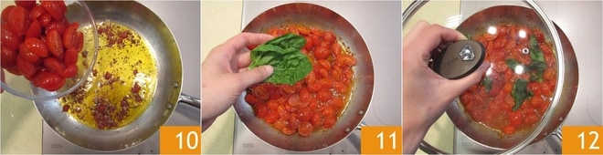 Agora, adicione os tomatinhos 10 e refogue em fogo alto por cerca de 5 minutos, depois tempere moderadamente com sal e adicione o ramo de manjericão 11. Cubra com a tampa 12 e cozinhe em fogo baixo por 15 minutos. Quando o molho estiver reduzido, desligue o fogo e remova o manjericão.
