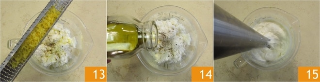 Para preparar a ricota batida, coloque a ricota em um recipiente, tempere com sal, pimenta e aromatize com a casca de limão ralada 13. Adicione o óleo em fio 14 enquanto bate com um mixer de imersão com movimentos de baixo para cima 15.