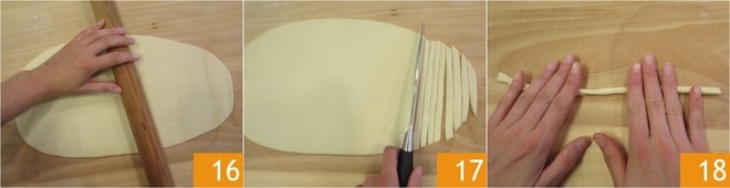 Após o tempo de descanso da massa, estenda-a com um rolo até a espessura de 1 cm 16, depois corte tiras com largura de meio cm 17. Trabalhe cada tira com a ponta dos dedos para alongá-la e formar um cordão 18.