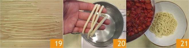 Quando os pici estiverem prontos 19, leve ao fogo uma panela com água salgada e cozinhe-os por cerca de 3 minutos 20. Escorra os pici em uma tigela e adicione o molho de tomatinhos 21, alternando a massa com o molho. Misture bem para integrar tudo.
