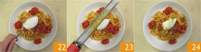Complete cada prato com uma colherada de ricota batida 22, um pouco de casca de limão ralada 23, uma pitada de pimenta e algumas folhas de manjericão. Seus pici com tomatinhos e ricota ao aroma de limão estão prontos para serem servidos 24!