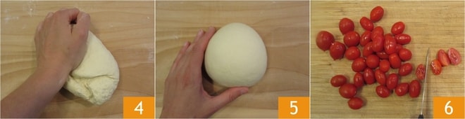 Trabalhe a massa até obter uma mistura bastante dura, lisa e homogênea 4. Forme uma bola 5, cubra-a com a tigela virada para baixo e deixe descansar em temperatura ambiente por 30 minutos. Enquanto isso, lave e corte os tomatinhos ao meio 6.