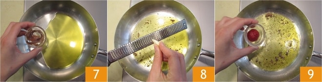 Prossiga com a preparação do molho: aqueça o óleo em uma frigideira com os filés de anchova 7, depois adicione o alho ralado 8 e o extrato de tomate 9. Deixe refogar por alguns minutos.
