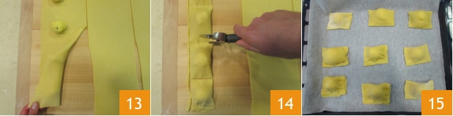 Dobre a folha sobre si mesma para cobrir o recheio 13, depois com um cortador de massa ondulado, corte 'raviólis' de cerca de 8 cm de comprimento e 5 cm de largura 14. Com estas quantidades, obterá cerca de 30 raviólis. Coloque os piconi em uma assadeira forrada com papel manteiga 15.