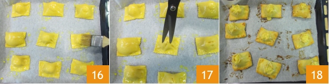 Pincele a superfície com a mistura de ovos e leite 16 e, com uma tesoura, faça um corte em forma de 'x' na superfície 17. Asse no forno estático a 180° por cerca de 25 minutos. Quando estiverem prontos, retire os piconi marchigiani do forno e deixe esfriar um pouco antes de saboreá-los 18.