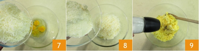 Adicione também o parmesão 7 e o pecorino ralados 8, misture para combinar e, por fim, adicione sal e pimenta 9.