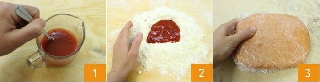 Para preparar os pie pops, comece preparando a massa brisée vermelha seguindo nossa receita de massa brisée de tomate: misture o concentrado de tomate na água gelada 1. Continue com a técnica de sablage: coloque em um mixer a farinha peneirada, a manteiga fria, uma pitada de sal e bata tudo até obter uma mistura arenosa. Disponha a mistura obtida em uma bancada formando um monte e adicione no centro o concentrado de tomate diluído na água 2, amasse tudo rapidamente até obter uma massa compacta. Quando estiver pronta, envolva sua massa brisée em um filme plástico 3 e deixe descansar na geladeira por pelo menos 40 minutos.