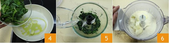 Agora dedique-se à massa brisée verde: salteie os espinafres em uma frigideira com um fio de azeite e um dente de alho 4, quando estiverem macios transfira-os para o mixer e bata-os com a dose de água fria que deve ser adicionada à farinha, ou seja, 35 ml 5. Continue fazendo a sablage com a farinha e a manteiga no mixer 6,