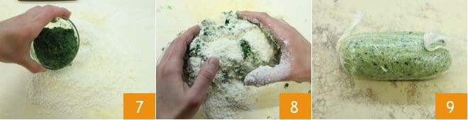 depois despeje a mistura em uma bancada e adicione os espinafres picados 7, amasse para misturar os ingredientes 8 e depois forme um bloco, envolva-o com filme plástico 9 e coloque na geladeira para firmar por cerca de 40 minutos. Agora ocupe-se do recheio: pique o queijo caciocavallo e o presunto, seque os tomates com papel toalha para remover o excesso de óleo e depois corte-os em pedacinhos.