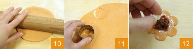 Agora tudo está pronto para compor os pie pops: pegue o bloco de massa brisée de tomate, estenda-o com o rolo 10 até obter uma espessura de 2 mm corte com cortadores de biscoito as formas desejadas 11 certificando-se de que sejam duplas, pincele o recorte de massa com a clara do ovo, recheie o centro com os tomates secos e o caciocavallo 12,