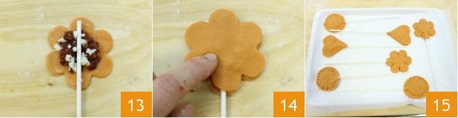 coloque no meio um palito alimentar 13 e depois feche com o recorte da mesma forma 14. Reserve os pie pops em uma bandeja revestida com papel manteiga 15.
