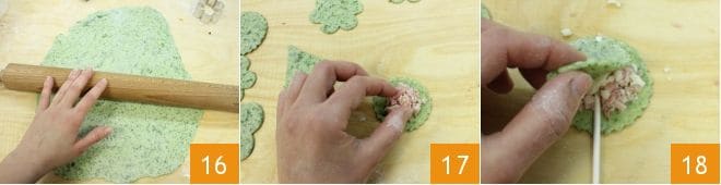 Proceda da mesma maneira com a massa brisée verde: estenda uma folha com espessura de cerca de 2 mm 16, pincele com o ovo e recheie-a com o recheio de caciocavallo e presunto cozido 17. Feche com outro recorte de massa 18.