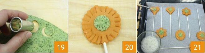 Se quiser tornar os pie pops ainda mais coloridos, você pode recortar pequenas formas 19 para aplicar nos pie pops alternando as cores para criar um contraste bonito 20. Antes de assá-los, pincele os pie pops com a clara 21