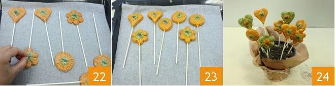 e, se desejar, decore com sementes de papoula 22, por fim, asse em forno estático pré-aquecido a 180° por cerca de 15 minutos (se forno ventilado a 160° por 5-10 minutos). Ao final do cozimento, deixe os pie pops esfriarem um pouco 23 e depois sirva-os colocando-os em um vaso como se fossem florzinhas apetitosas 24!