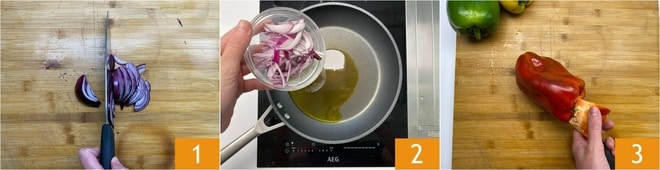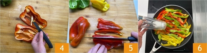 Divida-os ao meio e retire os filamentos internos e eventuais sementes 4. Em seguida, corte os pimentões em tiras 5 e, assim que a cebola estiver bem refogada, adicione-os na frigideira. Acrescente uma pitada de sal 6.