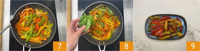 Cozinhe em fogo médio por cerca de 15 minutos, mexendo especialmente no início 7. À medida que amolecem, mexa o mínimo possível para que dourem bem. Aromatize com folhas de manjericão rasgadas à mão 8 e sirva seus pimentões na frigideira 9.