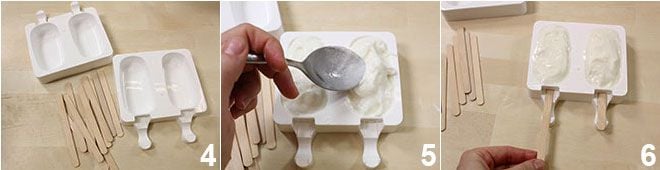 Agora, prepare tudo o que precisa para fazer seu pinguim: você precisará de moldes de silicone e palitos de sorvete 4. Preencha os moldes com o sorvete 5, nivele bem e bata um pouco o molde para evitar bolhas e, por último, insira os palitos 6. Deixe os sorvetes endurecerem no freezer durante a noite.