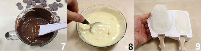Passado esse tempo, derreta o chocolate amargo e o branco em banho-maria ou no micro-ondas (7-8) e deixe esfriar à temperatura ambiente. Retire os sorvetes do freezer e desenforme-os 9.