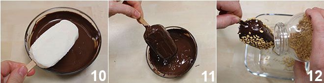 Merque 3 sorvetes no chocolate amargo, tomando cuidado para selar bem o fundo com o chocolate, sem deixar espaços abertos ou buracos por onde o sorvete possa escapar (10-11). Deixe-os esfriar no freezer sobre uma folha de papel manteiga por pelo menos uma hora. Se quiser decorá-los com granulados de avelã, coloque-os no chocolate assim que mergulhá-los, caso contrário, o chocolate endurece rapidamente 12.