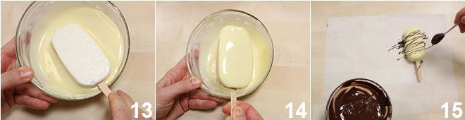 Os outros 3 mergulhe no chocolate branco, sempre selando bem o fundo (13-14). Coloque imediatamente no freezer seus pinguins sobre uma folha de papel manteiga por pelo menos uma hora. Uma vez frios, você pode decorá-los com o chocolate amargo restante. E aqui está o picolé pinguim pronto para ser degustado!