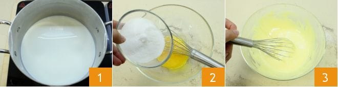 Para preparar a pinolata, comece pelo creme: em uma panela grande, despeje o leite 1 e aqueça em fogo baixo. Enquanto isso, em uma tigelinha, coloque as gemas, adicione o açúcar granulado 2 e bata com um batedor 3.