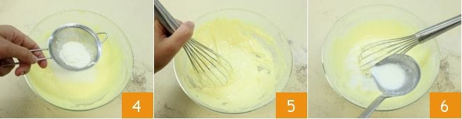 Em seguida, adicione a farinha peneirando-a com uma peneira 4 e misture novamente com o batedor para incorporar os ingredientes 5. Neste ponto, quando o leite estiver quente, desligue o fogo e despeje-o aos poucos sobre a mistura de ovos, açúcar e farinha, ajudando-se com uma concha 6. Adicione pouco a pouco, continuando a misturar com o batedor para que não se formem grumos.