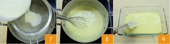 Coe o creme obtido e despeje-o na panela onde você havia aquecido o leite 7; cozinhe o creme em fogo baixo, mexendo continuamente com um batedor 8 até levar a uma leve ebulição. O creme estará pronto quando estiver mais espesso, a ponto de cobrir uma colher de madeira. Então, desligue o fogo e transfira o creme obtido para um recipiente grande 9. Cubra com filme plástico em contato e deixe de lado em temperatura ambiente para esfriar.