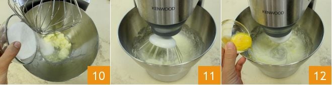 Enquanto o creme esfria, passe a preparar a massa. Na tigela de uma batedeira, coloque a manteiga em pedaços à temperatura ambiente, adicione o açúcar granulado 10 e comece a bater 11; com as pás ainda em funcionamento, adicione a gema 12.