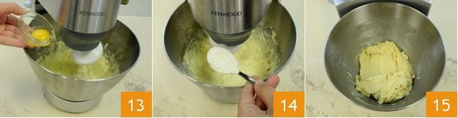 Quando a gema estiver incorporada, adicione o ovo inteiro 13 e continue batendo; em seguida, adicione a farinha e o fermento, previamente peneirados juntos, aos poucos com a ajuda de uma colher 14. Trabalhe a massa até obter uma mistura homogênea e macia 15.