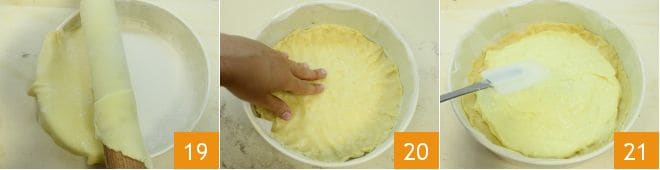 Com a ajuda do rolo de massa, desenrole o disco de massa sobre a forma 19 e com as mãos faça a massa aderir perfeitamente ao fundo 20 e às bordas. Então, pegue o creme que esfriou e despeje na forma, ajudando-se com uma espátula para espalhá-lo uniformemente por toda a superfície 21.