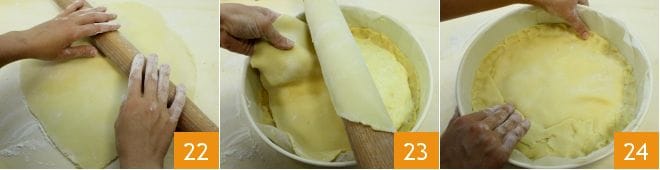 Agora você pode abrir a outra metade da massa 22 para criar o disco de cobertura do mesmo diâmetro e espessura do anterior. Com a ajuda do rolo de massa, coloque-a delicadamente sobre o creme 23 e faça as bordas aderirem à base 24 para fechar o bolo.