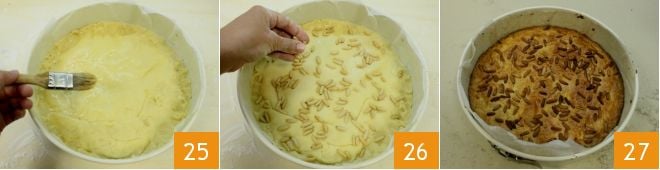 Em uma tigelinha, bata o ovo com o leite fresco, depois pincele a superfície do bolo com um pincel 25. Em seguida, espalhe os pinhões em chuva 26 para decorar a superfície. Então, asse a pinolata em forno estático pré-aquecido a 180° por cerca de 40 minutos (se forno ventilado, asse a 160° por 30-35 minutos). Quando o bolo estiver levemente dourado na superfície, retire-o do forno 27 e deixe esfriar à temperatura ambiente. Depois, desenforme a pinolata e, se quiser, pode polvilhá-la com açúcar de confeiteiro antes de servir!