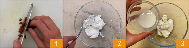 Para preparar a pinsa com flores de abobrinha, anchovas e creme de queijo, primeiro pique os tomates secos 1. Em uma tigela, misture o queijo cremoso para passar com a ricota 2, depois adicione o leite 3.