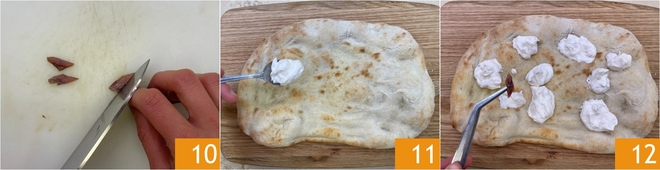 Por fim, corte as anchovas em óleo em losangos 10. Retire a base da pinsa do forno e recheie com montinhos de creme de queijo 11, depois acrescente os pedacinhos de anchova 12.