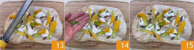 Distribua as flores de abobrinha sobre a superfície e aromatize com raspas de limão raladas 13 e algumas folhinhas de orégano fresco 14. A sua pinsa com flores de abobrinha, anchovas e creme de queijo está pronta para ser servida 15!