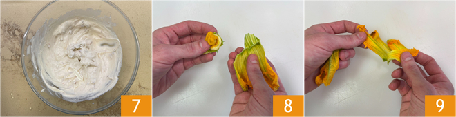 Você deve obter um creme macio e homogêneo 7. Asse a base da pinsa em forno ventilado pré-aquecido a 250° por 5 minutos. Enquanto isso, remova o pistilo das flores de abobrinha 8 e corte-as em tirinhas 9.