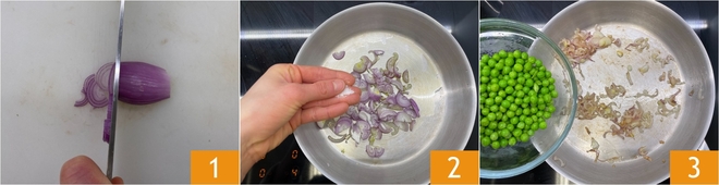 Para preparar a pinsa com gorgonzola, comece pelo creme de ervilhas: limpe e fatie finamente a chalota 1, depois coloque-a numa frigideira com um fio de azeite e uma pitada de sal 2 e deixe-a cozinhar em fogo baixo. Após cerca de 8 minutos, acrescente as ervilhas 3, tempere com sal e refogue por cerca de 5 minutos.