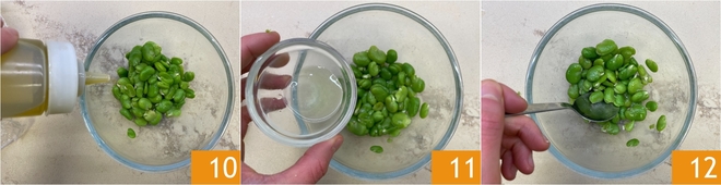 Tempere as favas com azeite 10, sal e suco de limão 11. Misture bem 12 e reserve.