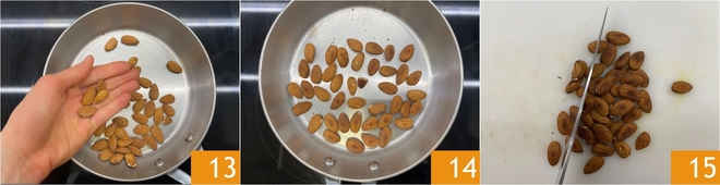 Por fim, cuide das amêndoas: coloque-as numa frigideira 13 e torre-as em fogo médio por cerca de 7-8 minutos 14. Depois de deixá-las esfriar, pique-as grosseiramente com uma faca 15.