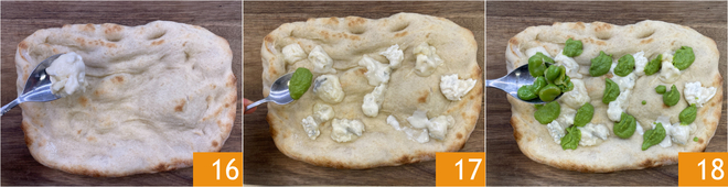 Agora aqueça a base para pinsa em forno ventilado preaquecido a 250° por 5 minutos. Retire do forno e coloque pedaços de gorgonzola 16 e colheradas do creme de ervilhas 17, depois distribua as favas 18.