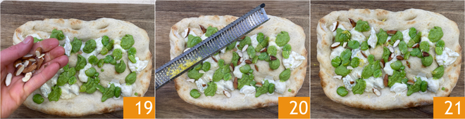 Acrescente também as amêndoas tostadas 19 e as raspas de limão raladas 20. A sua pinsa com gorgonzola está pronta para ser saboreada 21!