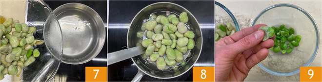 Reserve e passe para as favas: escalde-as em água salgada por 3 minutos 7, depois escorra 8 e deixe esfriar. Uma vez mornas, remova a pele 9.