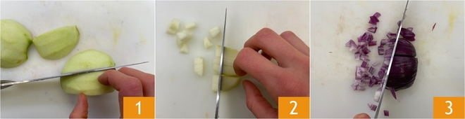 Para preparar a pinsa com mortadela e burrata, primeiro descasque as maçãs e corte-as primeiro em gomos 1, depois em fatias e, por fim, em cubinhos de aproximadamente 0,5 cm 2. Limpe e pique a cebola roxa 3.