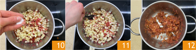 Tempere com sal 10, misture bem 11 e continue cozinhando em fogo médio-baixo por cerca de uma hora. O chutney deve desmanchar e reduzir 12. Deixe amornar.