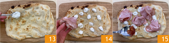 Agora aqueça a base para pinsa no forno ventilado pré-aquecido a 250°C por 5 minutos, depois retire e disponha pedaços de burrata 13. Coloque as fatias de mortadela 14 e distribua o chutney 15.