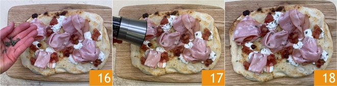 Por fim, guarneça com tomilho 16 e pimenta-do-reino 17. Sua pinsa com mortadela e burrata está pronta para ser saboreada 18!