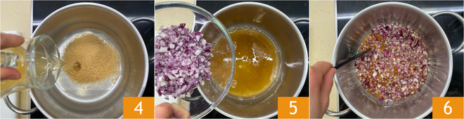 Em uma panela, coloque o açúcar mascavo e o vinagre de maçã 4, depois acrescente a cebola 5 e cozinhe em fogo médio até que o açúcar esteja dissolvido 6.