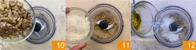 Por fim, prepare o pesto de nozes: coloque os 130 g restantes de nozes no mixer 10 e bata para picá-las finamente, depois adicione o Grana Padano ralado 11 e o azeite 12.