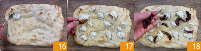 Nesse ponto, aqueça a base da pinsa no forno ventilado pré-aquecido a 250° por 5 minutos, depois distribua sobre a superfície colheradas de pesto de nozes 16, o radicchio 17 e o speck crocante 18.