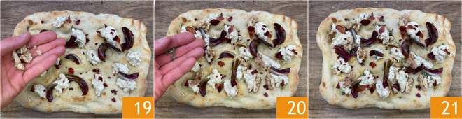 Finalize com as nozes tostadas 19 e algumas folhinhas de tomilho 20. Sua pinsa radicchio, speck e nozes está pronta para ser servida 21!
